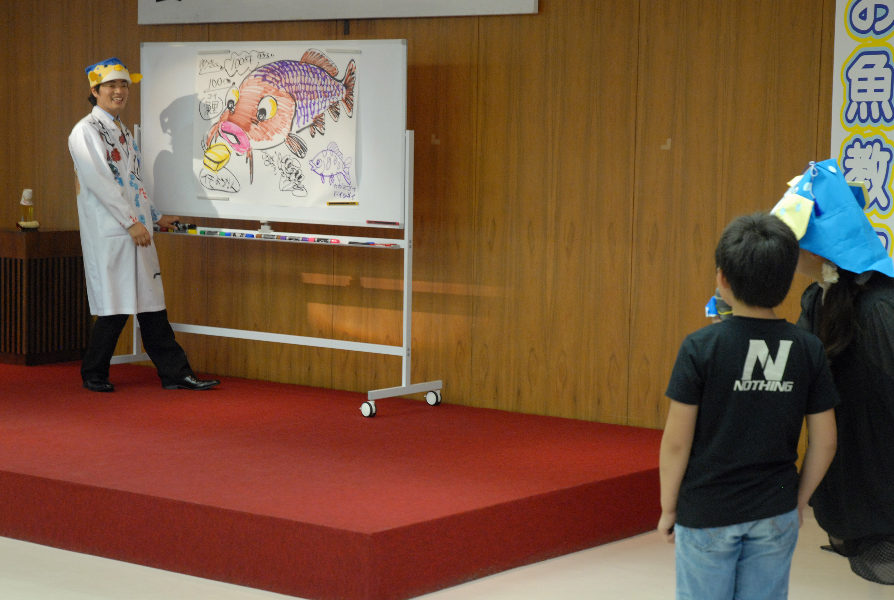 さかなクンが描いていく絵を見ながら、参加者した児童約100名に魚のクイズに挑戦して貰らい、正解した児童に描いた絵がプレゼントされました。参加した児童からは、さかなくんが関心する答えや難解な質問が出され最後まで楽しい時間をすごしました。